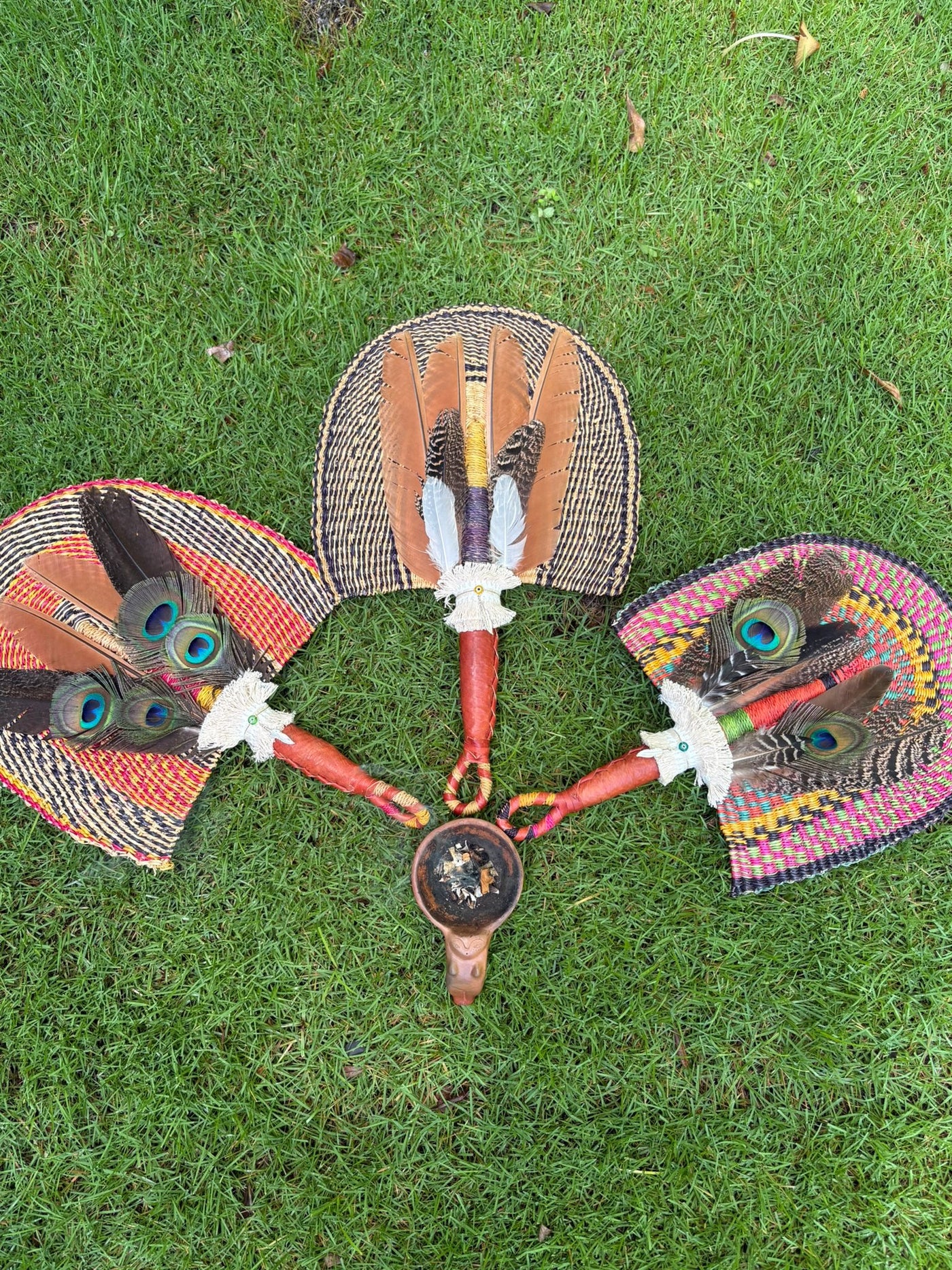 Fabiola adorned each fan with her feather magic, awakening them as spiritual companions and ceremonial tools. Their vibrant hues carry the frequency of joy, creativity, and protection.